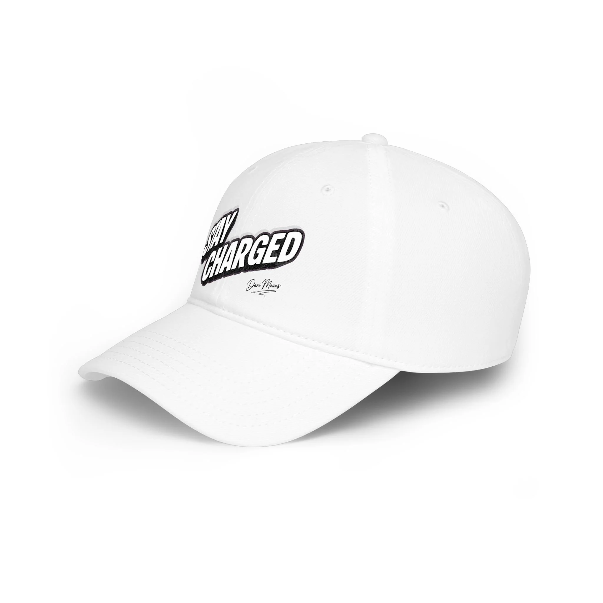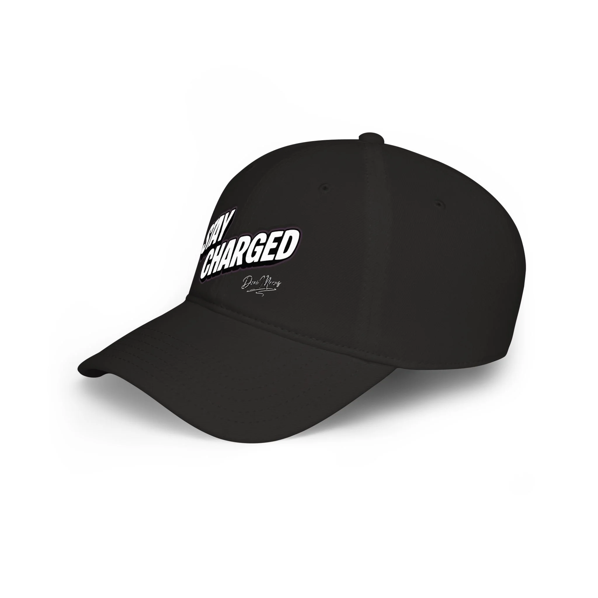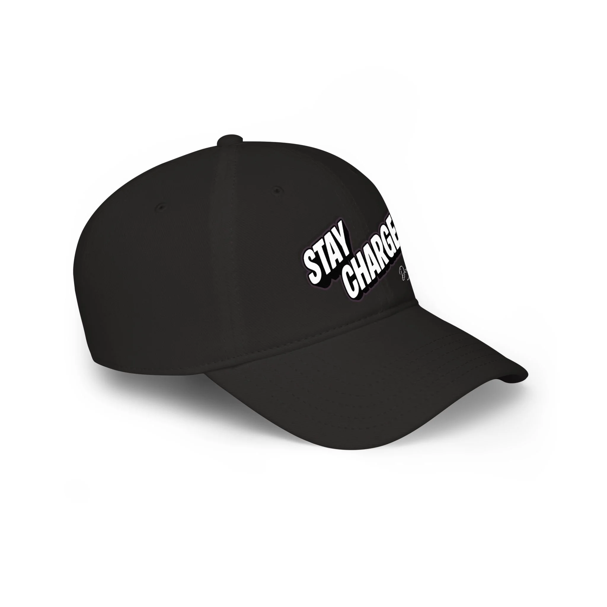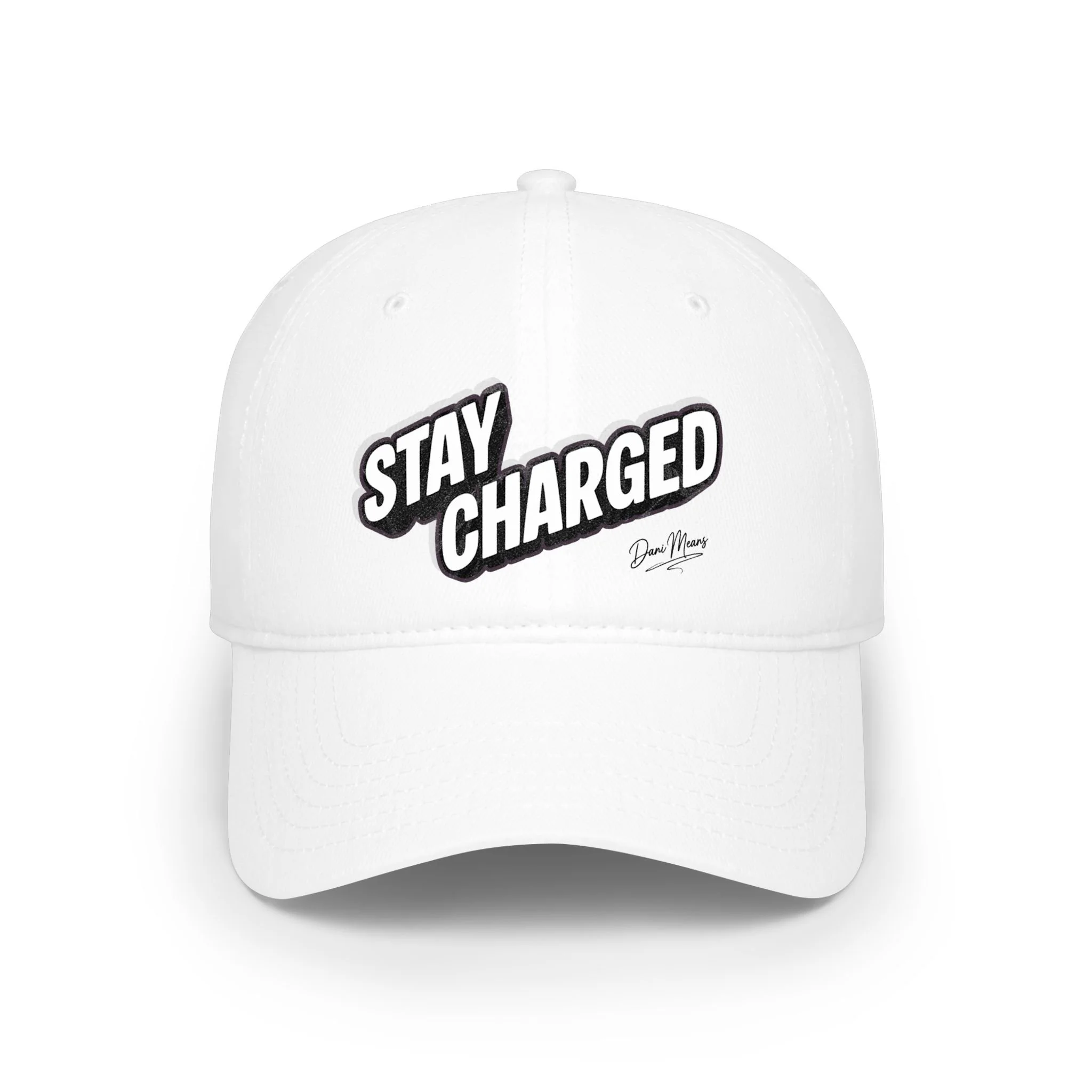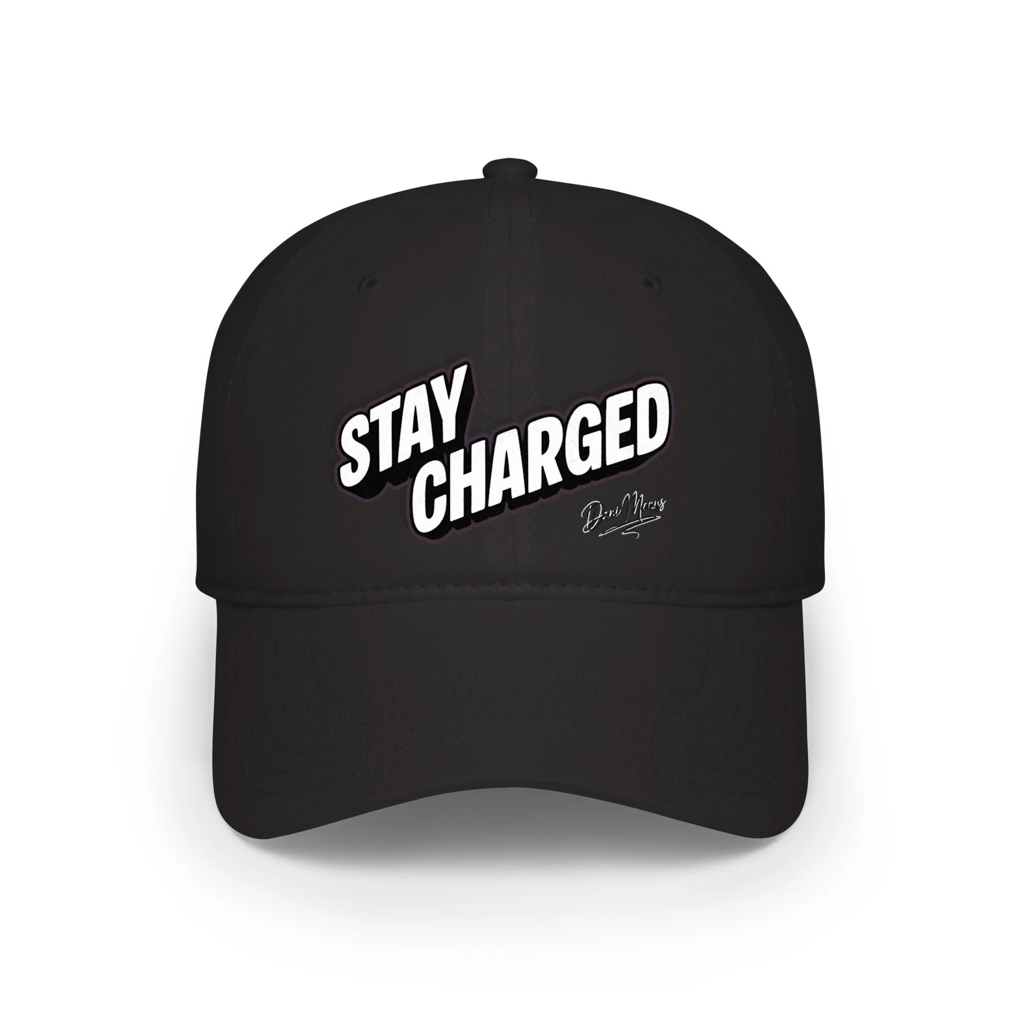 - Bold embroidered "STAY CHARGED" graphic in contrasting white